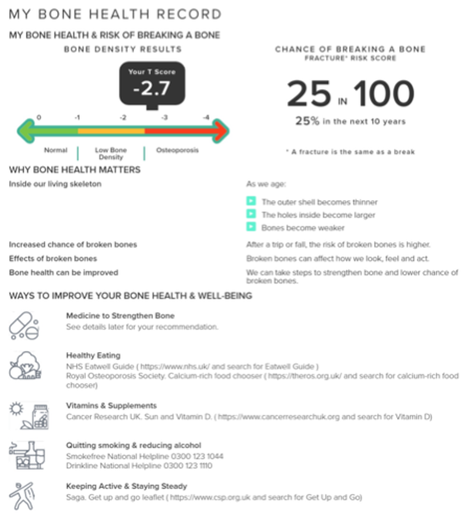 When health professionals use the Osteoporosis Options tool in their consultations, they may give you a Bone Health Record afterwards.